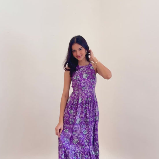 Purple Floral Hand Block Printed Cotton Maxi Dress with One Side Pocket